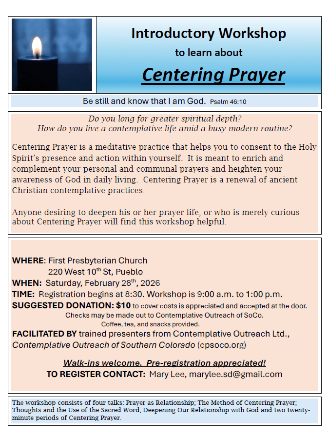 If you would like to schedule a Centering Prayer Introductory Workshop for your group, church or location, please send us a message at info@cpsoco.net.